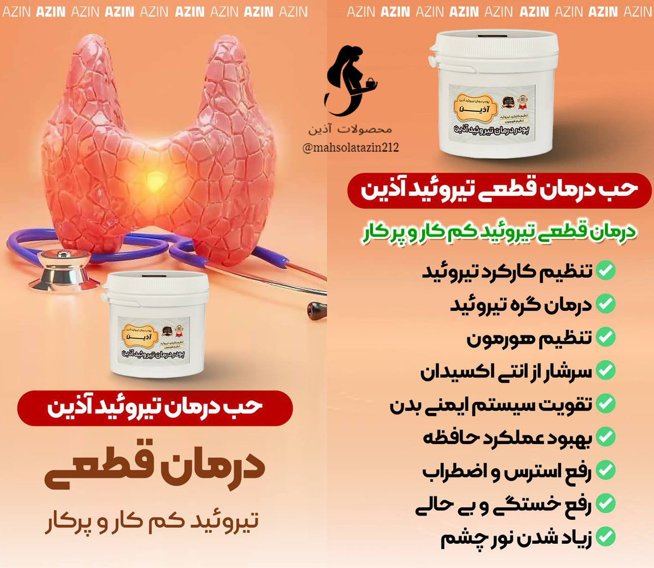 با پکیج درمان تیروئید آذین، گامی استوار به سوی سلامتی پایدار بردارید و رهایی از مشکلات تیروئید را تجربه کنید!"